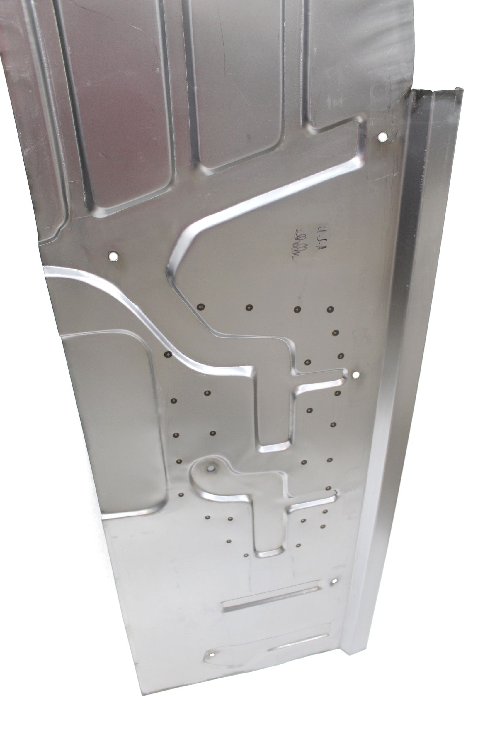 Our Floor Panels are 22″ wide and extend from the firewall seam to the rear seat riser in length. Our die stamped panel is manufactured in heavy 18 gauge steel and now includes the seat anchor plates pre-attached. Note that our Floor Panel thresholds are properly formed and are arched front to rear just like the original floor panel which will allow for proper Rocker Panel placement and the maintenance of original body shape and proper door fit upon completion.