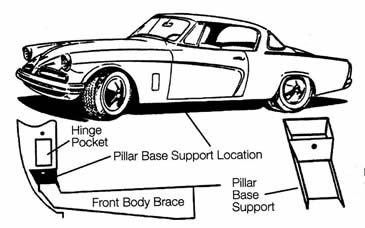 The most critically stressed portion of your Studebaker body is the front pillar base area. This area is usually the most seriously weakened part of your car body, being the first area of the floor to rust out. If the pillar base area has disintegrated, the body brace and pillar wing may be supporting nothing.